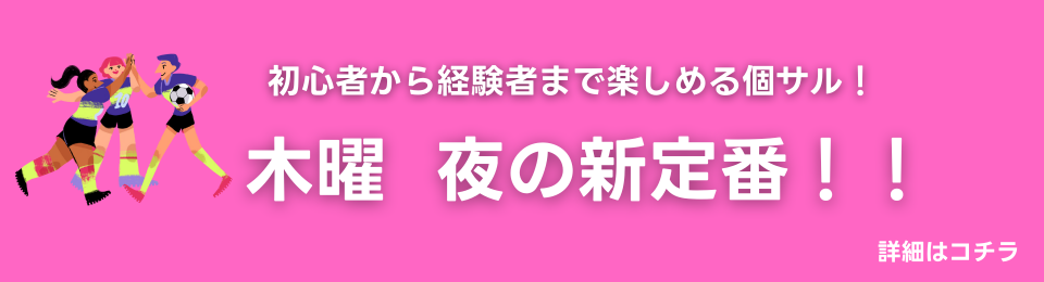 週間スケジュール 10月14日(火) 【20:30 - 22:30】個サル 経験者向け個サル【★★~★★★★】 10月15日(水) 【20:30 - 22:00】初心者・女性向け教室 大人向けレッスン 初心者・女性向けレッスン【☆~★】【21:00 - 22:30】個サル オーバー35個サル【★★~★★★★】【21:00 - 22:30】個サル オーバー35個サルキーパー専属枠【★★~★★★★】 10月16日(木) 【20:30 - 22:30】個サル 初中級個サル【★~★★★】 10月17日(金) 【20:30 - 22:30】個サル 中上級個サル【★★★~★★★★★】※チーム参加OK!【20:30 - 22:30】個サル 中上級個サル【★★★~★★★★★】※キーパー専属 10月18日(土) 【09:00 - 10:30】個サル 2面開催オーバー35個サル【★★~★★★★】【10:30 - 12:30】個サル 経験者向け個サル【★★~★★★★】 10月19日(日) 【14:30 - 16:30】第6回!3人制ジュニア大会『3on3バトル』1年-2年クラス【16:30 - 18:30】第6回!3人制ジュニア大会『3on3バトル』3年-4年クラス【18:30 - 20:30】第6回!3人制ジュニア大会『3on3バトル』5年-6年クラス 10月20日(月) 【20:30 - 22:30】個サル エンジョイクラス【☆~★★】 前週 今週