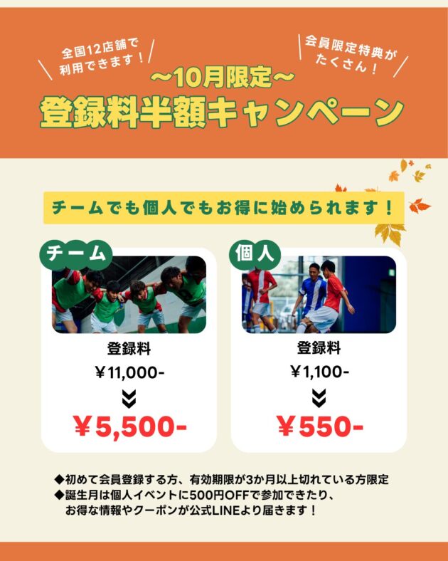 未登録チームの方が10月中に大会参加またはレンタルコートをご利用された場合、