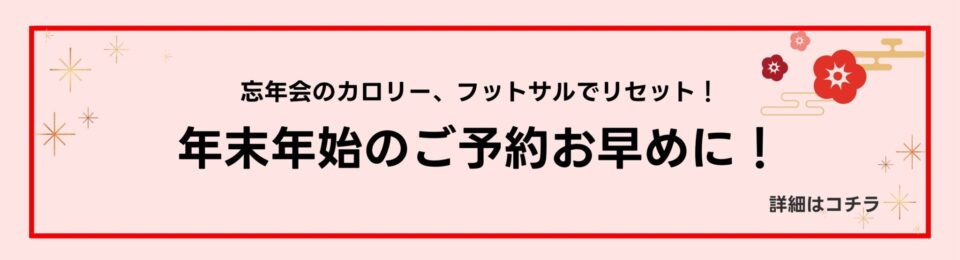 週間スケジュール 11月29日(土) 【16:00 - 17:00】子供/親子向け フットサル教室(年中から小学3年生)※前日予約で参加費1,100円→900円【17:00 - 18:00】子供/親子向け フットサル教室(小学3年生から6年生)※前日予約で参加費1,100円→900円【18:30 - 20:00】個サル(試合がしたい!) 初心者向けゆるゆるクラス※集まった人数で練習して試合します!※前日予約で会員参加費1,430円→1,300円、次回予約1,100円、割引券併用OK!【アリーナプラシャツ着用で参加費半額!】【20:00 - 22:00】個サル(試合がしたい!) エンジョイ※激しいプレー、強いキック禁止※前日予約で会員参加費1,430円→1,300円、次回予約1,100円、割引券併用OK!【アリーナプラシャツ着用で参加費半額!】 11月30日(日) 【10:00 - 11:20】子供/親子向け 親子フットサル教室(年中から小学3年生)※前日予約で参加費1,650円→900円【10:00 - 12:00】個サル(試合がしたい!) エンジョイ※激しいプレー、強いキック禁止※前日予約で会員参加費1,430円→900円【12:00 - 14:00】個サル(試合がしたい!) 初中級※前日予約で会員参加費1,430円→1,300円、次回予約1,100円、割引券併用OK!【17:00 - 18:00】子供/親子向け 子供フットサル教室(年中から小学3年生)※前日予約で参加費1,100円→900円【18:00 - 19:00】子供/親子向け 子供フットサル教室(小学3年生から6年生)※前日予約で参加費1,100円→900円【19:00 - 21:00】個サル(試合がしたい!) エンジョイ※激しいプレー、強いキック禁止※前日予約で会員参加費1,430円→900円 12月1日(月) 【16:15 - 17:00】子供/親子向け 子供フットサル教室(年中から年長)※前日予約で参加費1,100円→900円【17:10 - 18:10】子供/親子向け 子供フットサル教室(年長から小学3年生)※前日予約で参加費1,100円→900円【18:10 - 19:30】子供/親子向け 子供フットサル教室(小学3年生から小学6年生)※前日予約で参加費1,650円→1,430円【20:00 - 22:00】個サル(試合がしたい!) エンジョイ※激しいプレー、強いキック禁止※前日予約で会員参加費1,430円→1,200円、次回予約1,100円 12月2日(火) 12月3日(水) 12月4日(木) 【20:00 - 22:00】個サル(試合がしたい!) 初中級※前日予約で会員参加費1,430円→1,100円、次回予約1,000円 12月5日(金) 【21:00 - 23:00】個サル(試合がしたい!) エンジョイ※激しいプレー、強いキック禁止※前日予約で会員参加費1,430円→1,200円、次回予約1,100円 前週 今週