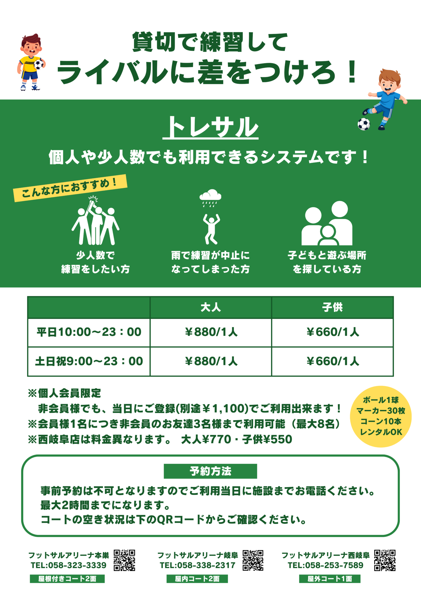 貸切で練習してライバルに差をつけろ! 2025年12月20日 施設ブログ 皆さんトレサルってご存じですか? トレサルとは個人でも少人数でもコートを利用できるシステムです! 少人数で練習をしたい方、 雨で練習が中止になってしまった方、 家族で遊ぶ場所をお探しの方たちにおすすめです! ※12月22日(月)から料金が変更になります。 詳しくは下記をご覧ください! 個人参加でも試合や練習が楽しめます!詳しくはこちらから みんなでわいわいレンタルコート!詳しくはこちらから 5人集まって楽しく大会参加!詳しくはこちらから アルバイト募集中!詳しくはこちらから
