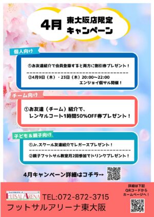 東大阪限定キャンペーン! 2026年4月1日 施設ブログ 4月始めるなら今! 東大阪限定キャンペーン! フットサルを始めたい方、フットサルに興味を持っているお友達など お誘いいただき、ぜひ東大阪にボールを蹴りにきてください! お待ちしておりますね!