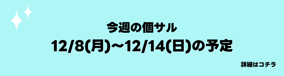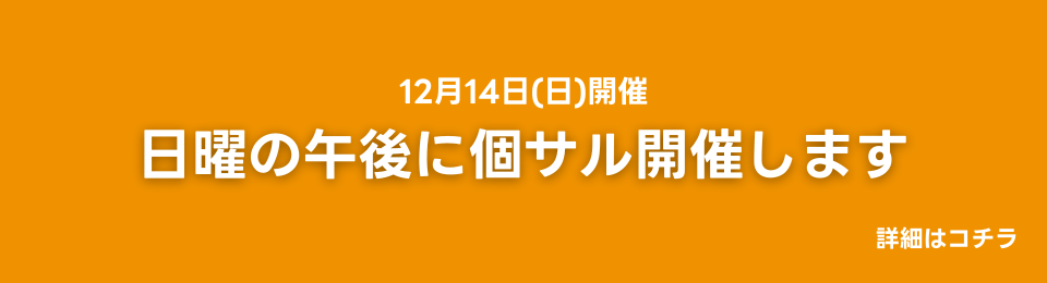 週間スケジュール 12月11日(木) 【21:00 - 22:30】個サル 中上級クラス 12月12日(金) 【19:30 - 21:00】個サル エンジョイクラス 12月13日(土) 【09:00 - 10:30】個サル エンジョイクラス 12月14日(日) 【14:00 - 15:30】個サル エンジョイクラス※会員限定先着10名様参加費500円off(ホームページからの申込限定)【14:30 - 15:30】親子 親子レッスン 【15:30 - 16:30】親子 親子サル 12月15日(月) 【21:00 - 22:30】個サル 後藤個サル 12月16日(火) 12月17日(水) 【20:00 - 21:30】個サル ゆるゆるエンジョイ個サル 前週 今週