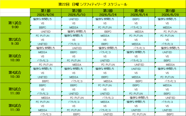 2026年4月26日(日)スタートの日曜 シリフィティリーグ対戦表になります。