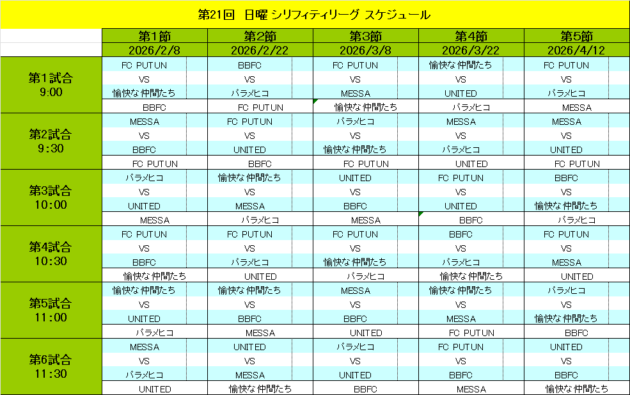 2026年2月8日(日)スタートの日曜 シリフィティーリーグ対戦表になります。
