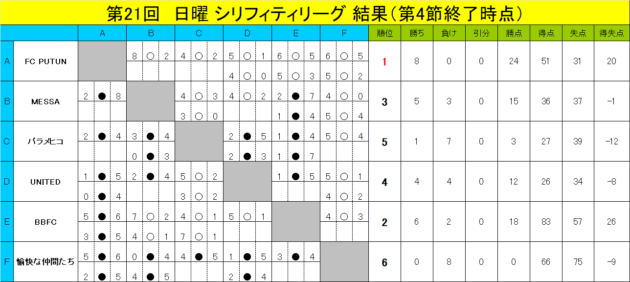【3月22日(日)】 第21回 日曜 シリフィティリーグ 第4節結果 優勝チーム 定期的に試合を楽しみたいチームはお気軽にお問い合わせください! 現在リーグに参加しているチームの半数は年齢層高めのチームなので、おじ様チームも大歓迎! 参加チーム BBFC MESSA FC UNITED パラメヒコ FC PUTUN 愉快な仲間たち