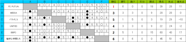 【3月8日(日)】 第21回 日曜 シリフィティリーグ 第3節結果 優勝チーム 定期的に試合を楽しみたいチームはお気軽にお問い合わせください! 現在リーグに参加しているチームの半数は年齢層高めのチームなので、おじ様チームも大歓迎! 参加チーム BBFC MESSA FC UNITED パラメヒコ FC PUTUN 愉快な仲間たち