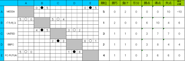 【10月12日(日)】 第20回 日曜 シリフィティリーグ 第1節結果 優勝チーム 定期的に試合を楽しみたいチームはお気軽にお問い合わせください! 現在リーグに参加しているチームの半数は年齢層高めのチームなので、おじ様チームも大歓迎! 参加チーム BBFC MESSA FC UNITED パラメヒコ FC PUTUN