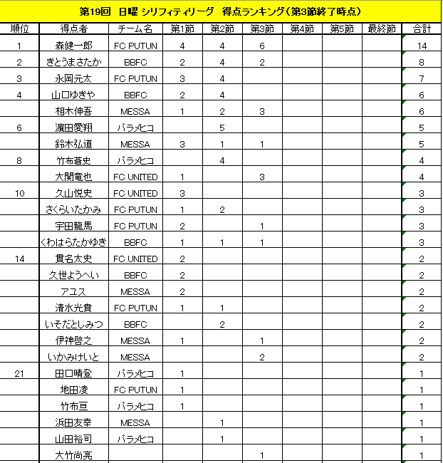 【8月10日(日)】 第19回 日曜 シリフィティリーグ第3節終了 優勝チーム 定期的に試合を楽しみたいチームはお気軽にお問い合わせください! 現在リーグに参加しているチームの半数は年齢層高めのチームなので、おじ様チームも大歓迎! 参加チーム BBFC MESSA FC UNITED パラメヒコ FC PUTUN