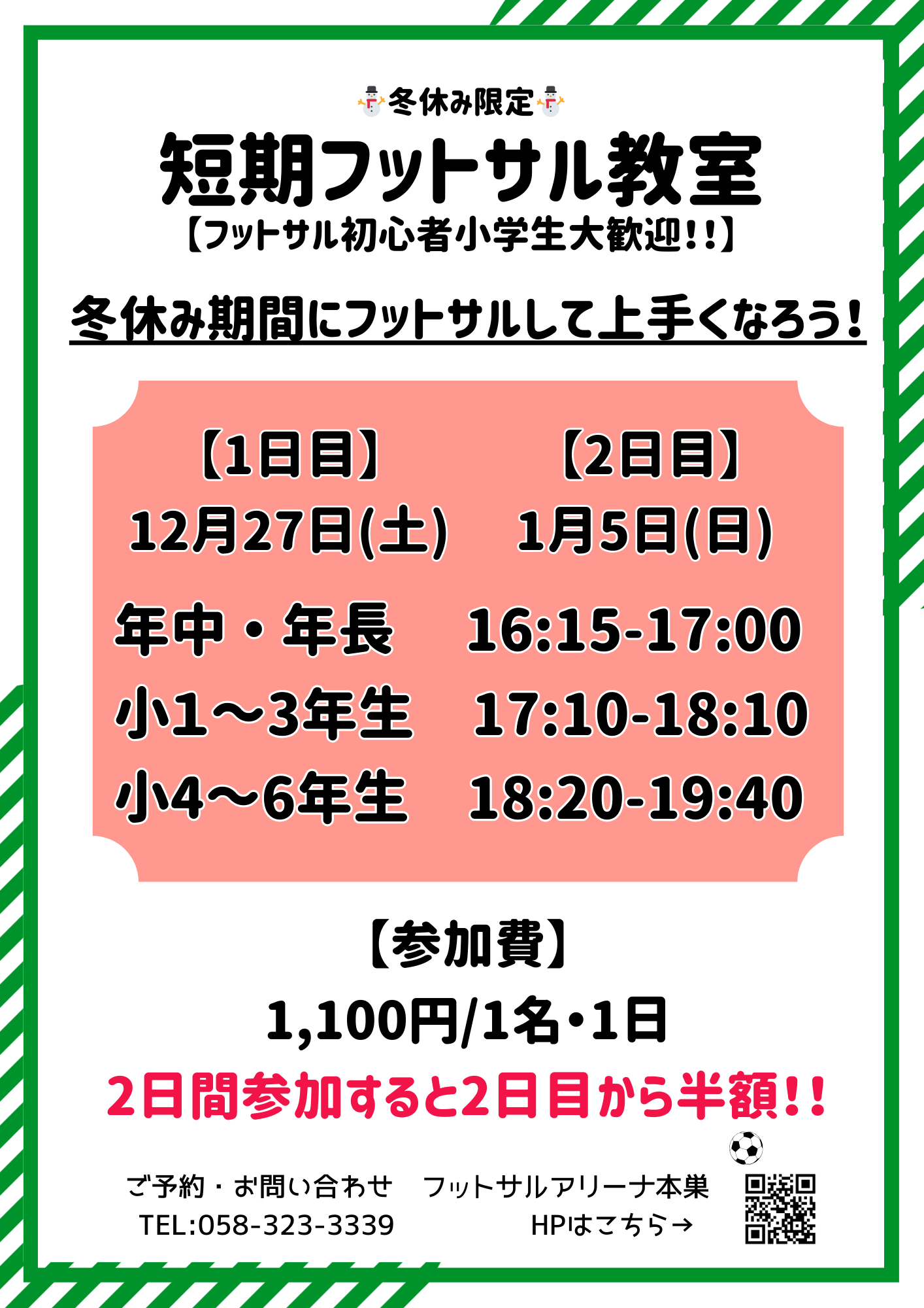 冬休みJr.短期フットサル教室開催! 2025年12月7日 スクール 冬休み期間にフットサル教室開催します! 休みの日にもボール蹴る時間増やしませんか? 皆さんのご参加お待ちしております! 冬休み短期フットサル教室エントリーはこちらから