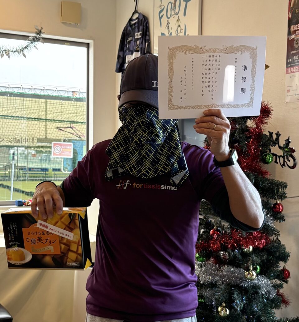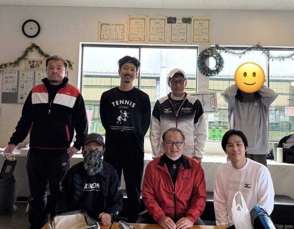 【12月26日(金)】 【テニス】男子シングルス大会🎾(初級~初中級) 優勝選手 優勝おめでとうございます!(K様) 参加選手 準優勝おめでとうございます!(T様) またのお越しをお待ちしております(集合写真)