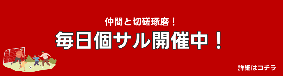 週間スケジュール 11月14日(金) 【21:00 - 22:30】個サル 中上級個サル【★★~★★★★】※チーム参加OK 登録チーム8,250円 GK専門930円 11月15日(土) 【14:00 - 16:00】個サル エンジョイ個サル【☆~★★】【20:00 - 23:00】エンジョイMIX大会 11月16日(日) 【09:00 - 10:30】個サル 1.5h 20名募集 オーバー35個サル【10:30 - 12:00】個サル 初中級個サル【13:00 - 16:30】大会に個人参加 アドバンスCUP※個人参加【13:00 - 16:30】★★★アドバンス CUP 11月17日(月) 【20:00 - 22:00】個サル エンジョイ個サル【☆~★★】 11月18日(火) 【20:30 - 22:00】個サル 中上級個サル【★★~★★★★】※チーム参加OK 登録チーム8,250円 GK専門930円 11月19日(水) 【20:00 - 22:00】個サル エンジョイ個サル【☆~★★】 11月20日(木) 【21:00 - 22:30】大人向けレッスン 初心者・女性向けレッスン【☆~★】※前田コーチ 前週 今週