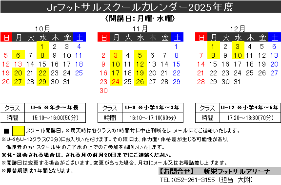 ジュニアスクール2025【改訂版】 2025年10月4日 スクール ジュニアスクール会員保護者様 いつも大変お世話になっております。 2025年12月のスクール開講日に変更がありますので、よろしくお願いいたします。 随時無料体験受付中!体験応募はコチラから!