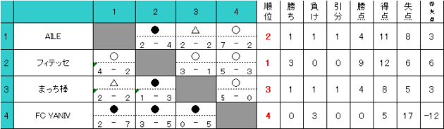 【10月5日(日)】 エンジョイCUP~誕生月+1点ver~ 優勝チーム フィテッセ 決勝 フィテッセ 5-3 AILE 3位決定戦 まっち棒 3-4 FC YANIV 参加チーム AILE フィテッセ まっち棒 FC YANIV