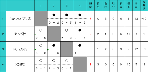 【1月25日(日)】 CILIFETY協賛エンジョイCUP 優勝チーム X58FC 優勝コメント 楽しかったです!! 決勝 X58FC 9-4 まっち棒 3位決定戦 FC YANIV 5-2 Blue cat ブン太 参加チーム Blue cat ブン太 まっち棒 X58FC FC YANIV くじ引きで賞品ゲットチーム