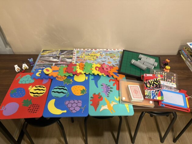 コーナーには、パズル・オセロ・トランプ・ウノ・折り紙・お絵描きセットなど、年齢に合わせて楽しめるアイテムをそろえています。